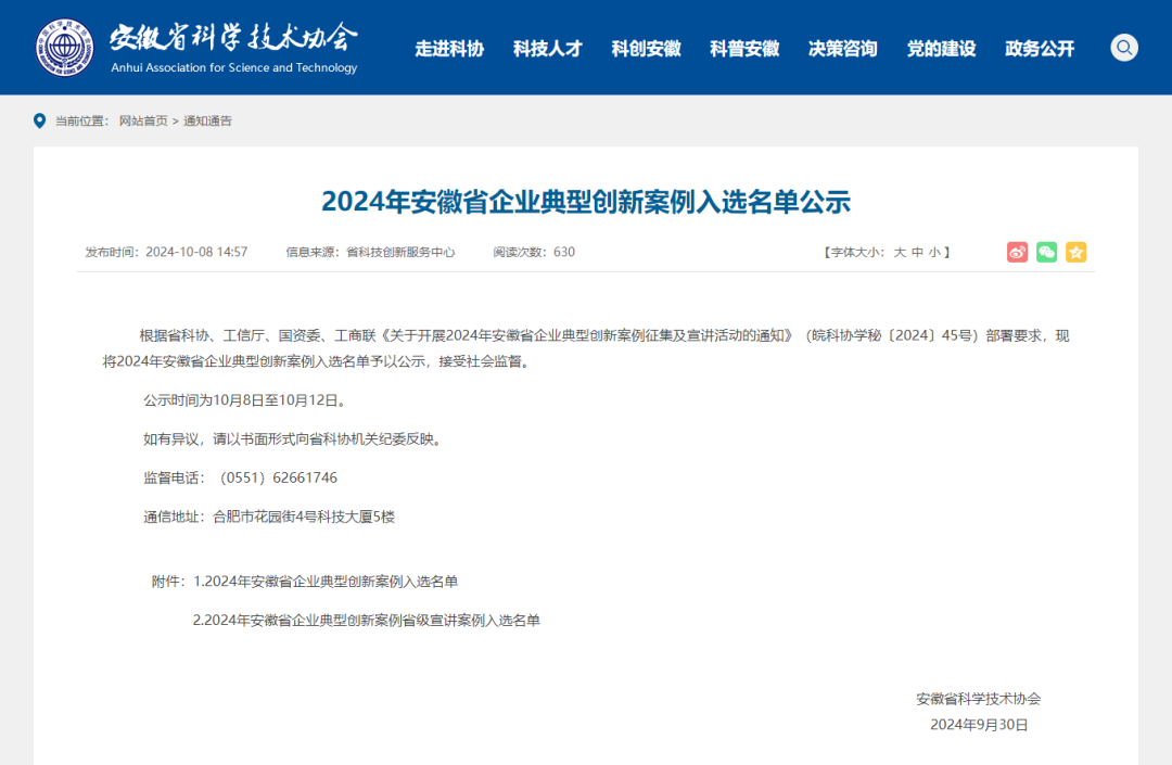 安徽省科学技术协会于2024年9月30日发布公告,根据省科协、工信厅、国资委、工商联《关于开展2024年安徽省企业典型创新案例征集及宣讲活动的通知》(皖科协学秘(2024)45号)部署要求,现将2024年安徽省企业典型创新案例入选名单予以公示。
