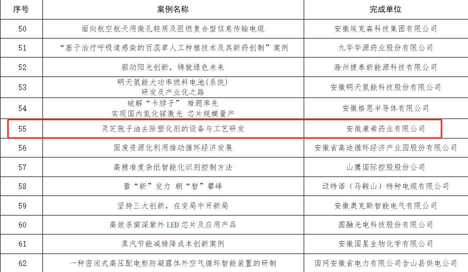 其中,安徽省食用菌行业协会常务理事单位——安徽康希药业有限公司的案例:《灵芝孢子油去除塑化剂的设备与工艺研发》赫然位于其中。